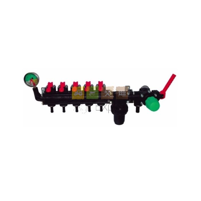 Vanne général manuel entrée diamètre 19 mm + vanne régulatrice mécanique avec retour cuve diamètre 25 mm + 5 vannes de section avec raccord diamètre 13 mm + filtre 160 l /min.