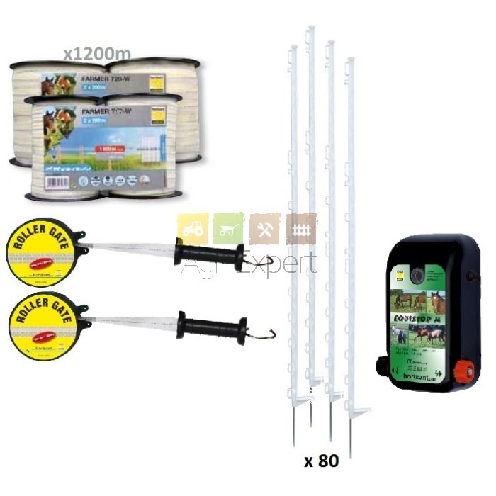 Kit clôture électrique 1 hectare Horizont cheval, poney avec 3 rangées de ruban, piquet hauteur 1.20m, 2 portillons, 1 électrificateur secteur 230 volts