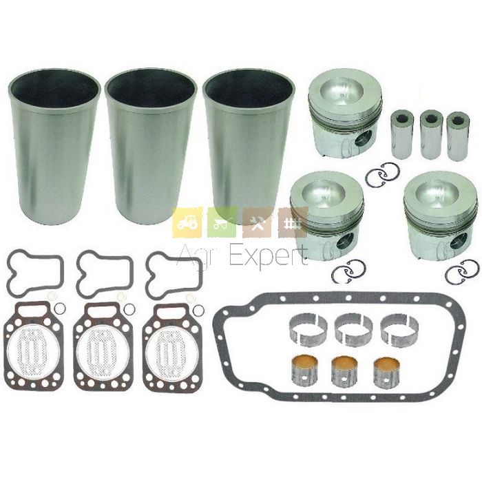 3 Chemises sèche alésage 105 mm hauteur total 214 mm, 3 Pistons à 4 segments (diamètre 105 mm hauteur 113,4 mm axe diamètre 35mm profondeur de chambre de combustion 20.25mm, Diamètre 62mm), 3 Jeu de segments