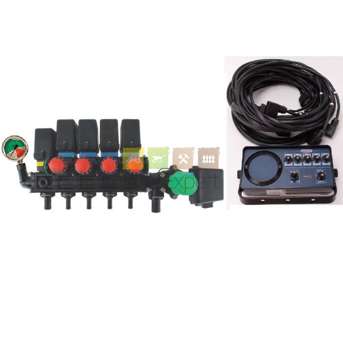 Le kit contient : 4 vannes de sections avec retour compensé, Vanne générale + vanne régulatrice mécanique + vanne régulatrice électrique (100 l / min) + boitier de commande (avec faisceau 4 m) + manomètre sur le groupe.