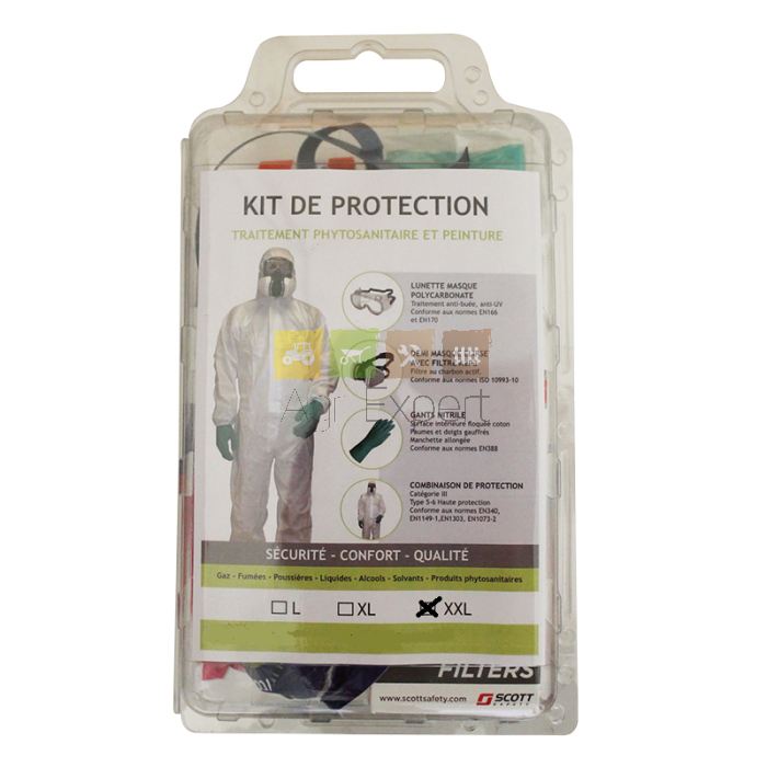 Le kit contient : un demi-masque, un kit de 2 filtres A2P3, une paire de lunette-masque 4800F, une combinaison Topsafe (taille XXL), une paire de gants Optinit (taille 10).