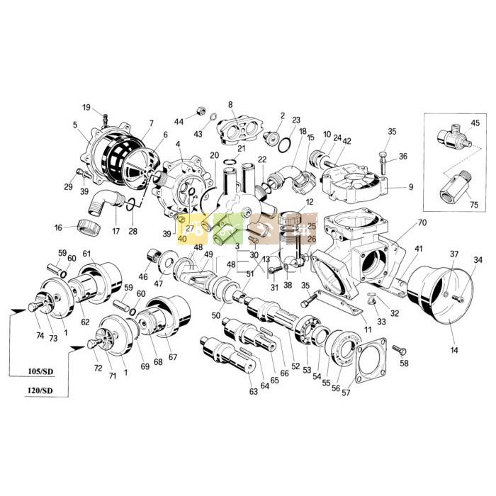 Kit vilebrequin pour pompe 105 & 120 / SD. Pompe 105 / SD : débit 100 l / min, pression 15 bars. Pompe 120 / SD : débit 120 l / min, pression 15 bars. Repères : 20, 21, 23, 24, 27, 54, 55.