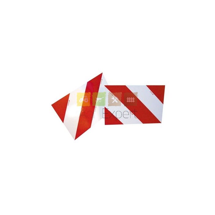Lot de 2 panneaux PVC à bandes rouges et blanches droit et gauche. Dimensions : 423 x 282 x 4 mm d'épaisseur. Revêtement RFT. Perçages à prévoir. Homologué classe 1 => uniquement pour les routes secondaires et doit être éclairé la nuit. Vendu par 5 unités.