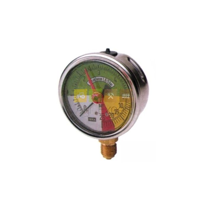 Ce manomètre est gradué tous les 0.2 bars de 0 à 15 bars et tous les 12bars de15 à 60 bars ces deux échelles sont marquées par un code de couleurs.