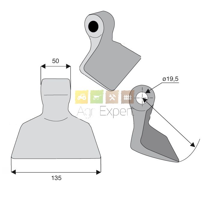 Marteau de broyeur alésage 19,5x50 - rayon 95 - largeur de travail 135 mm