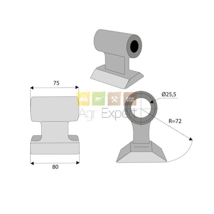 Marteau de broyeur alésage 25,5 - rayon 72 - largeur de travail 80 mm