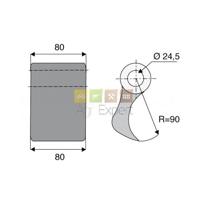 Marteau de broyeur alésage 24,5 - rayon 90 - largeur de travail 80 mm