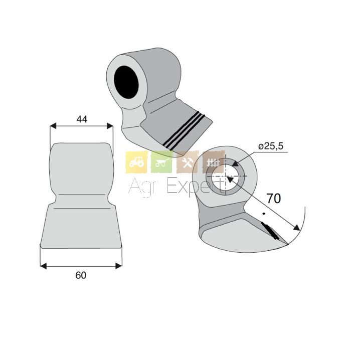 Marteau de broyeur alésage 25,5 - rayon 70 - largeur de travail 60 mm