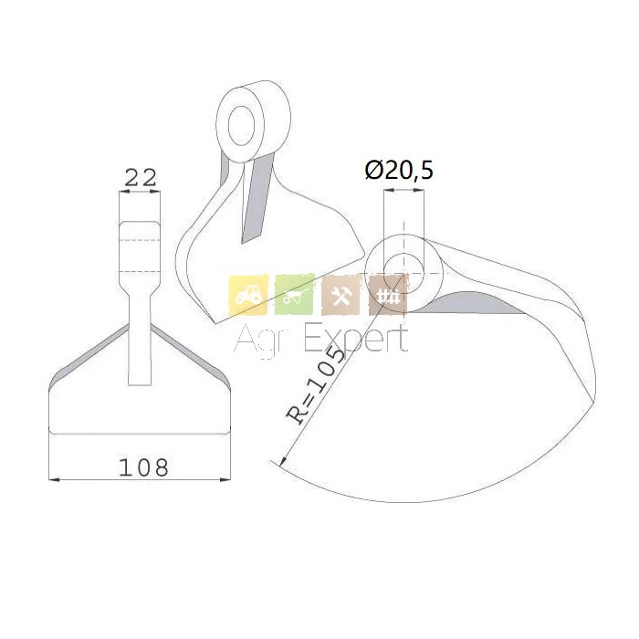 Marteau de broyeur alésage 25,5 - rayon 105 - largeur de travail 108 mm