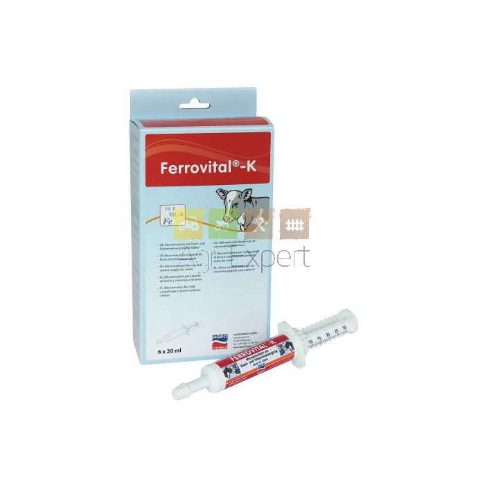 La pâte ferrugineuse Ferrovital®-K se présente sous forme de 6 seringues buccales de 20 ml qui contiennent une combinaison dosée en fer, vitamines A + E, huile à base de plantes, et lécithine. Ce complément est essentiel dans la défense immunitaire du veau (de 20 à 50 % des veaux, naissent avec une carence en fer). L'huile à base de plantes évite les troubles digestifs (diarrhées). Les vitamines A et E fortifient la muqueuse intestinale et affermissent la force de résistance. La fragilité des veaux durant les premières heures et les premiers jours est significativement réduite. Dosage 10 ml dans les 12 premières heures de la vie après ingération du colostrum (1 injecteur pour deux prises de 10 ml). La deuxième demi-dose peut être administrée le 12ème jour. Boite de 6 seringues buccales de 20ml soit 120ml.