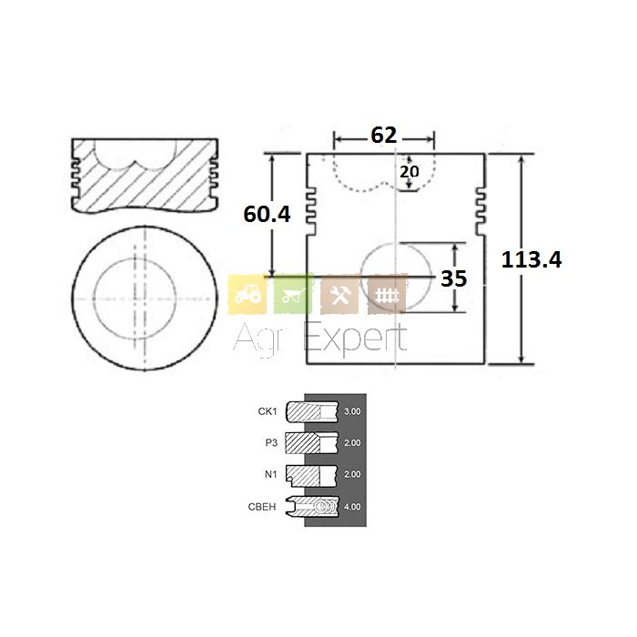 - 1 Pistons à 4 segments diamètre 105 mm hauteur 113,4 mm axe diamètre 35 x 82mm profondeur de chambre de combustion 20 mm Diamètre 62mm