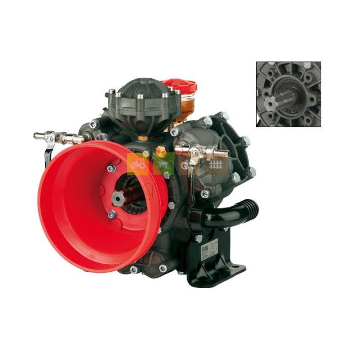 Pompe de pulvérisateur AR1203 à trois membranes, pour l'utilisation dans le secteur agricole professionnel sur les machines de pulvérisation pour les traitements dans les vergers ou les vignobles avec des produits phytosanitaires à haute pression. Pièces en contact avec les liquides pompés en aluminium anodisé et en AISI 303/304. Membranes en NBR. Joints en caoutchouc NBR. Boîtier moulé sous pression avec mécanique dans un bain d'huile, réservoir en matière plastique transparente pour un contrôle visuel du niveau. Équipé d'un amortisseur hydropneumatique pour une plus grande régularité de fonctionnement et des pulsations plus faibles dans le circuit de pression. Bouchon de vidange d'huile. Pistons avec segment pour une plus grande efficacité du système "coussin d'huile" à membrane. Système de blocage de membrane nouvellement conçu pour éviter le déchirement par contact, même dans des conditions difficiles. Vannes avec un profil de secteur sphérique qui offrent moins de résistance au passage du liquide et améliorent l'efficacité volumétrique. Complet avec soupape de surpression et protection cardan.