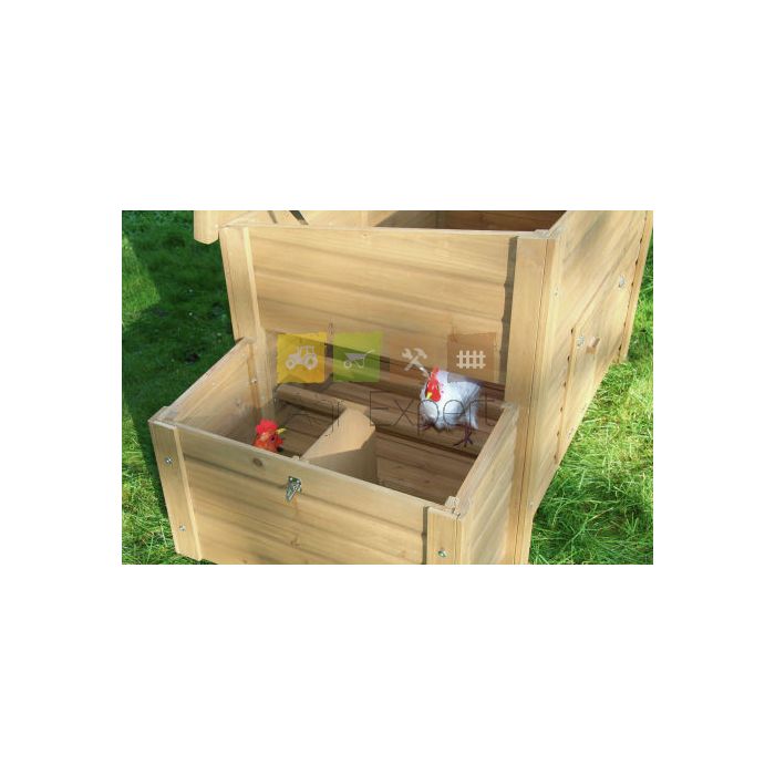 Poulailler en bois de haute qualité, fabrication robuste. L'embase surélevée offre une meilleure aération. Le toit est bitumé et ouvrable avec un système de blocage. Les parois extérieures sont en cunninghamia de qualité supérieure (bois) lasuré. Livré non monté, en carton, avec nid et perchoirs, notice de montage. Montage facile.