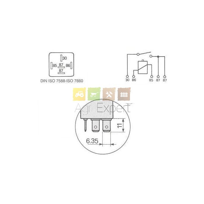 Relais 5 broches 12 volts 40 ampères. Conforme à la norme DIN ISO 7588 - ISO 7880.