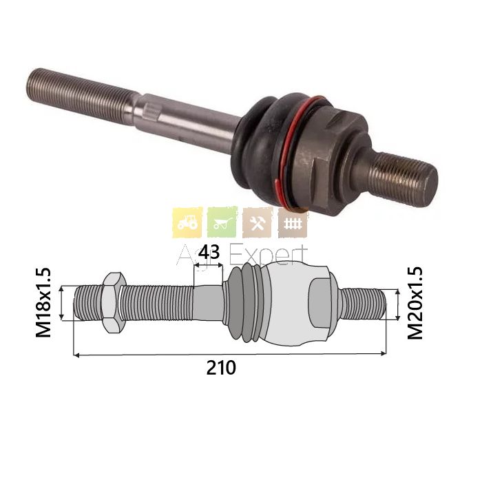 Rotule axial L210mm pour direction tracteur Goldoni Star 50, Star 90, Star 100, Star 3050, Star 3070, Star 3080, Star 4000, Aster 35, 40, 45, Quasar 85, 85, 90, Energy 60, 80, Compact 604, 614, 652, 654, 664, John-Deere Milenio
