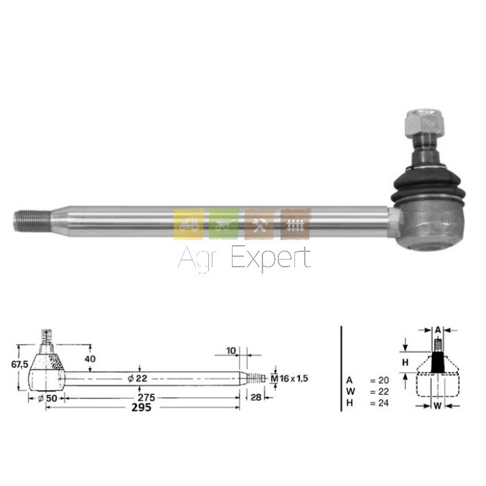 Rotule et tige de vérin de direction pour tracteur Lamborghini R 345, R 503, R 550, R 660, Same Centauro 70, Centurion 75, Condor 55, Falcon 50, Mercury 85, Minitaurus 60, Ranger 45, RowCrop, Solar, Taurus, Vigneron