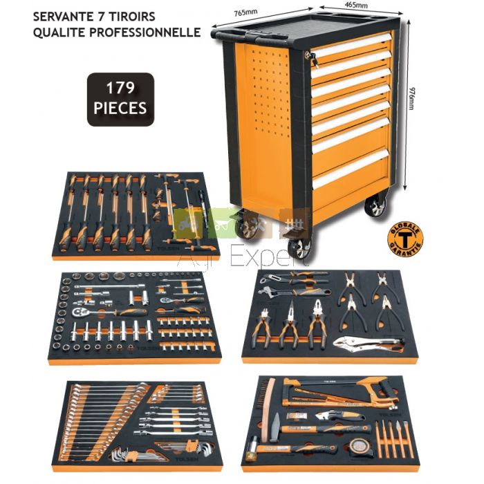 Servante avec 179 outils 7 tiroirs avec mousse de maintien des clés. composition TOLSEN