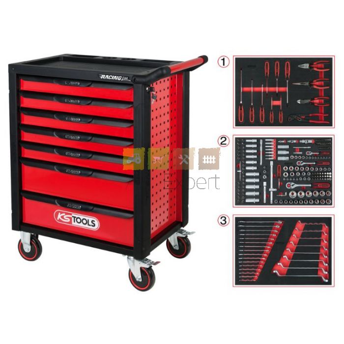Servante d’atelier métallique conçue pour un usage professionnel intensif. Fabriquée en tôle d’acier, elle est équipée de 7 tiroirs et livrée avec un ensemble complet de 215 outils répartis dans des modules adaptés à tous types d’interventions mécaniques.