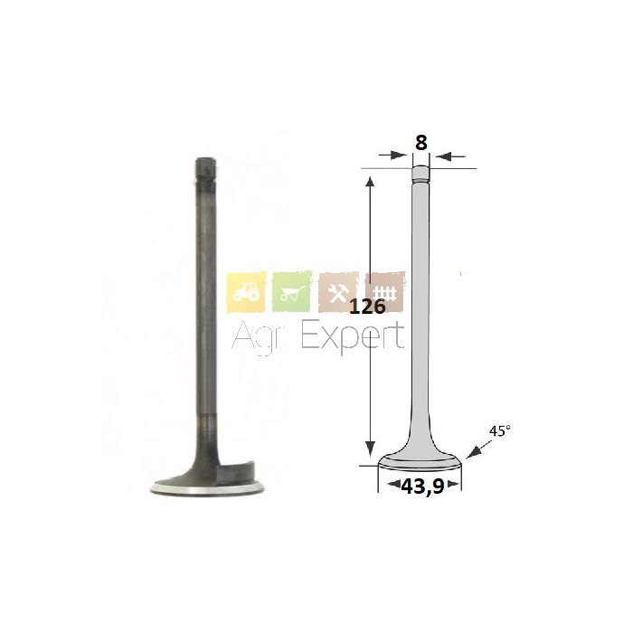 Soupape d'admission Fiatagri moteur Fiat IVECO 8025.01, 8025.02, 8035.01, 8035.02, 8035.04, 8045.01, 8045.02, 8045.04, 8055.04, 8065.02, 8065.04, 8065.24