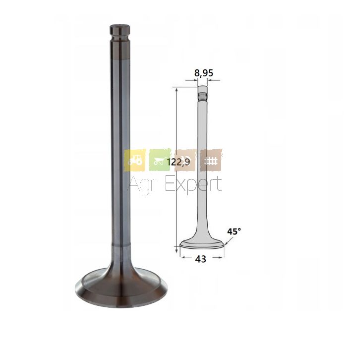 Soupape d'admissiontige 8,95 - hauteur 123 - tête 41 mm - angle 45° moteur Perkins 1004-40T AK, AL, 1004-40TW AM, AP, AQ, JCB, 1106C-E60TA VK, 1006-60 YG, 1006-60T YH, 1006-60TW YK, Landini, Hitachi, McCormick, Manitou, Fuchs, Terex, Claas, Weidemann, Zeppelin ...