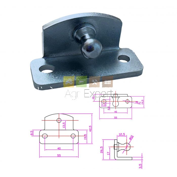Support vérin à gaz entraxe 40 mm avec boule Ø10 mm, utilisation Cabine, Capot, remorque, tracteur, Presse, Camping-car, camion...