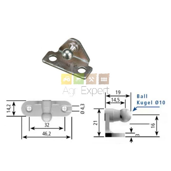 Support vérin à gaz entraxe 32 mm avec boule Ø10 mm, utilisation Cabine, Capot, Camping-car, remorque, tracteur, Presse, camion...