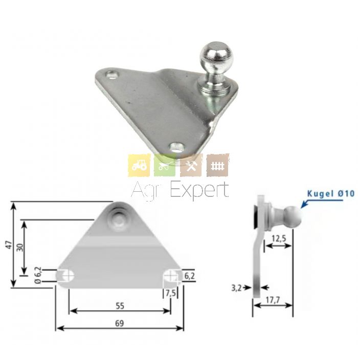 Support vérin à gaz entraxe 55 mm avec boule Ø10 mm, utilisation Cabine, Capot, remorque, tracteur, Camping-car, Presse, camion...