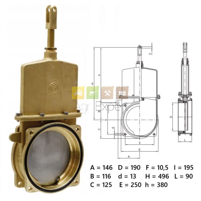 Vanne à guillotine avec corps en laiton et couteau en acier inoxydable MZ METALTECNICA 8" (200mm) avec 2 brides entraxe de fixation 250 mm pression de service 4 Bar