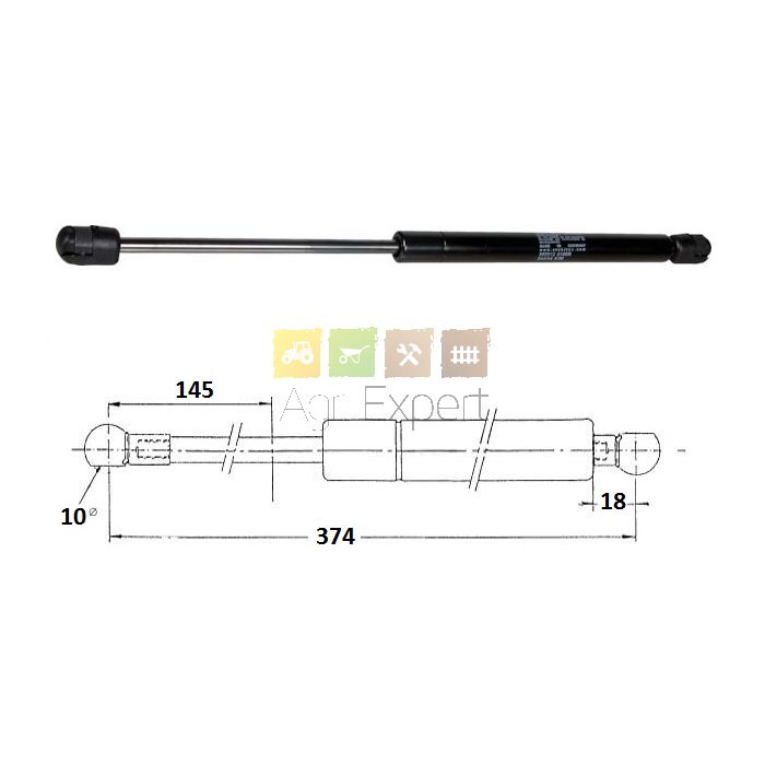 Vérin à gaz L374mm, force 100Nm, rotule 10 mm
